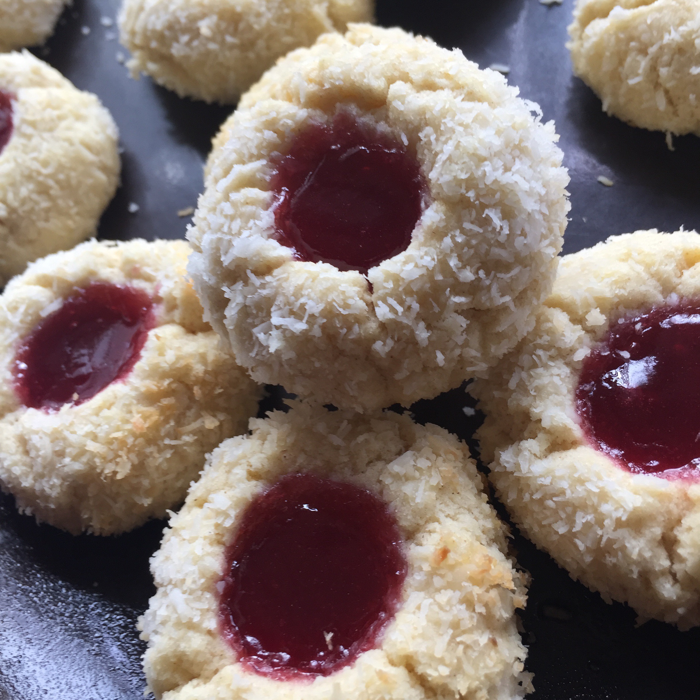 - Dip them in egg whites & roll them in coconut, placing them on a greased oven tray.