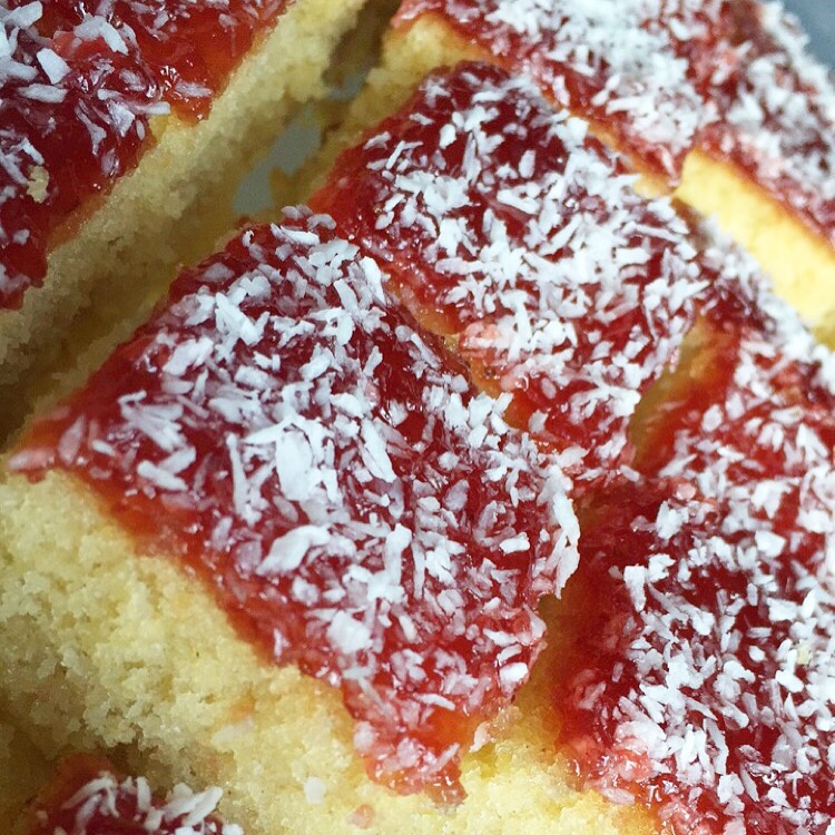 - Once cool spread jam, sprinkle desiccated coconut & cut into squares.